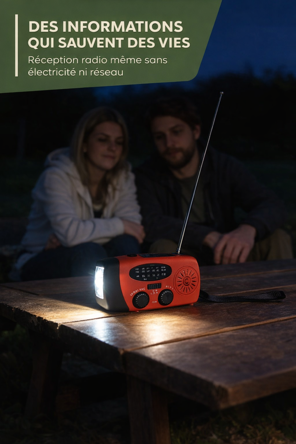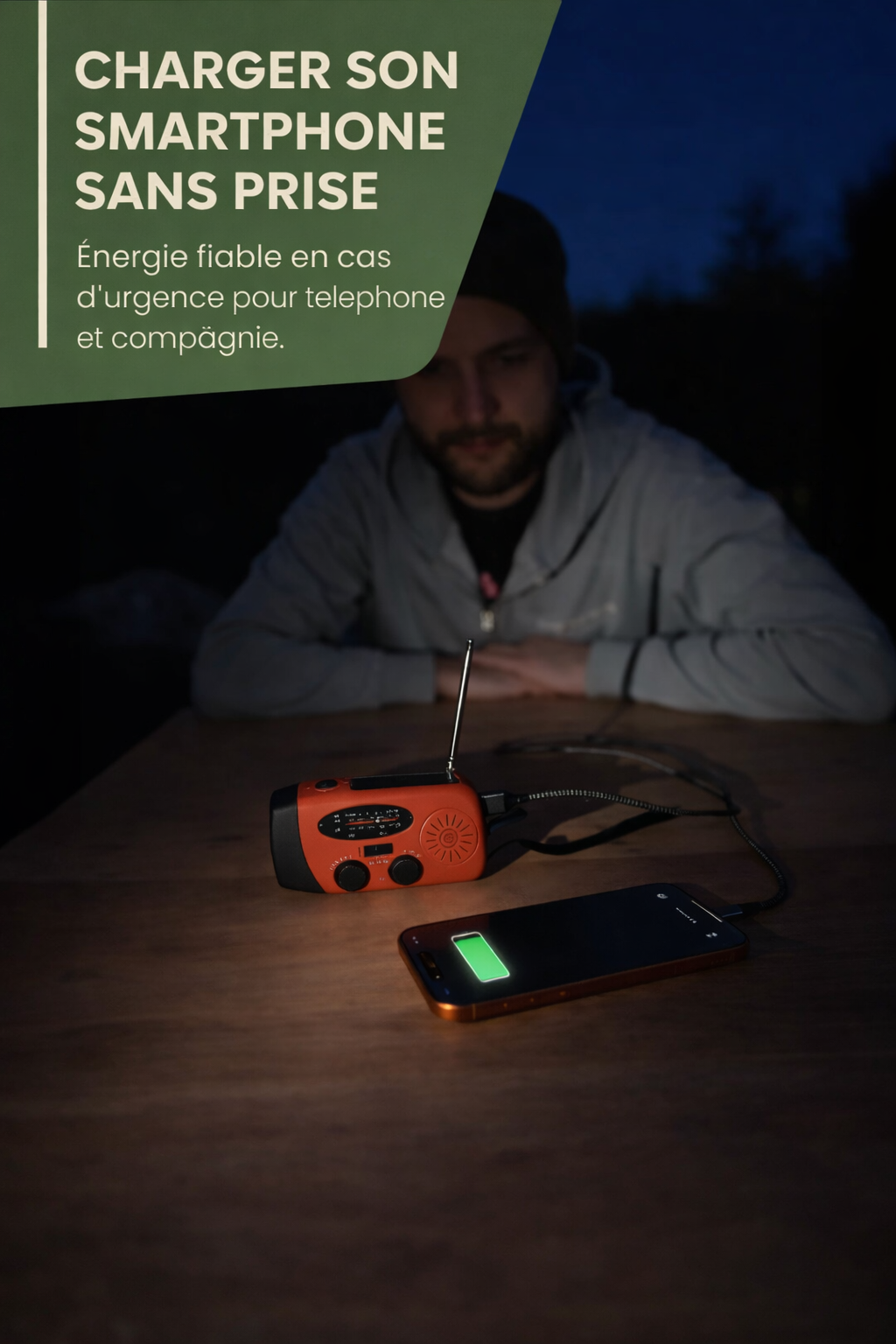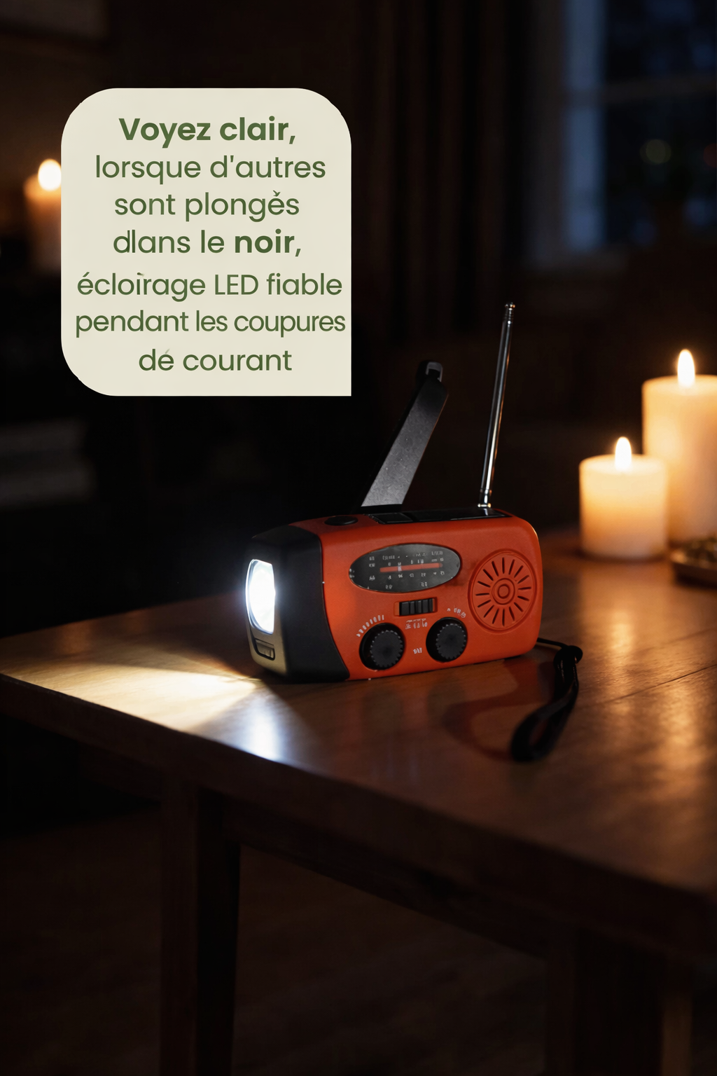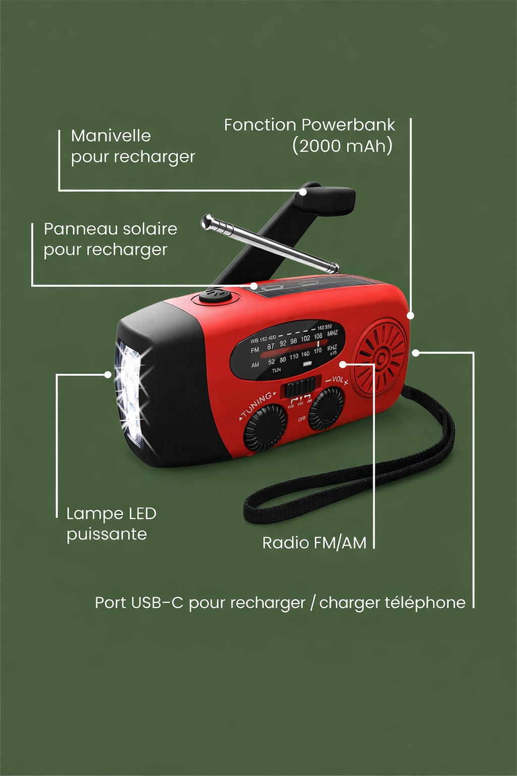 • Lumière, radio et chargement de téléphone 📻🔋