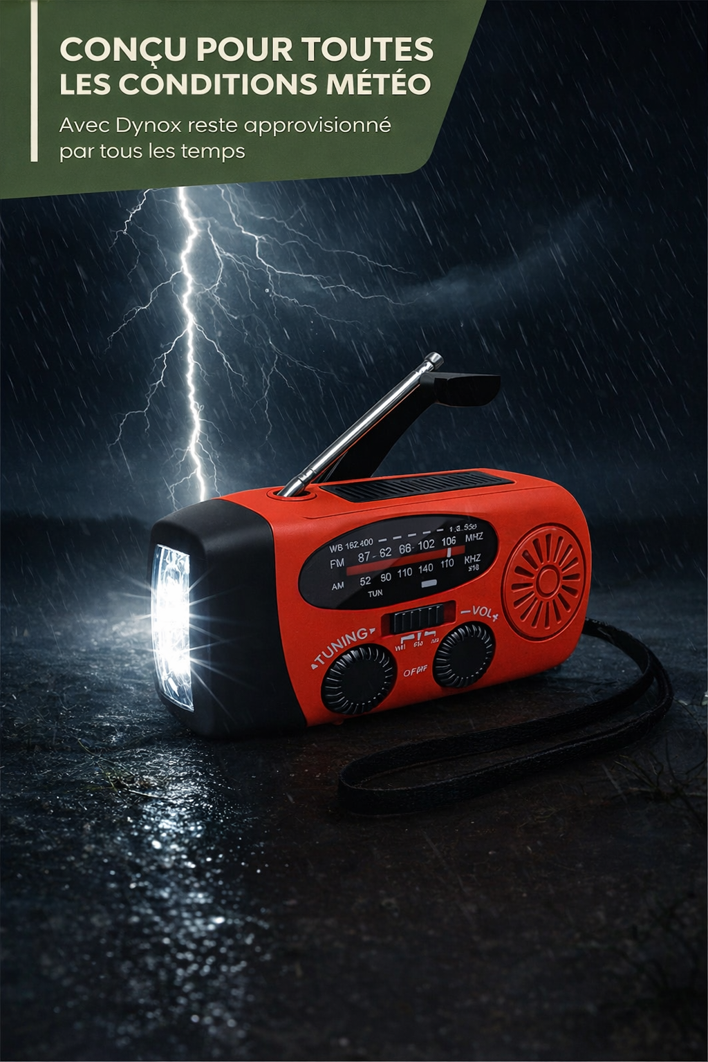 Le Dynox est équipé d’une batterie intégrée de 2000 mAh. Utilisez la lampe de poche, la radio et la fonction de charge, sans prise de courant.